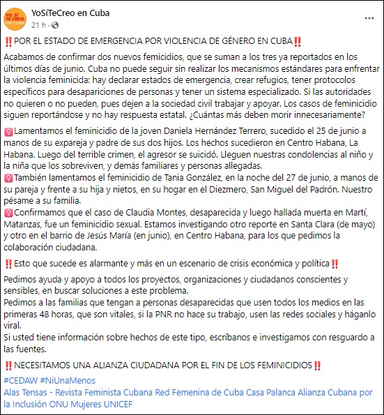 “Acabamos de confirmar dos nuevos feminicidios, que se suman a los tres ya reportados en los últimos días de junio. Cuba no puede seguir sin realizar los mecanismos estándares para enfrentar la violencia feminicida: hay que declarar estados de emergencia, crear refugios, tener protocolos específicos para desapariciones de personas y tener un sistema especializado”, se lee en la denuncia.