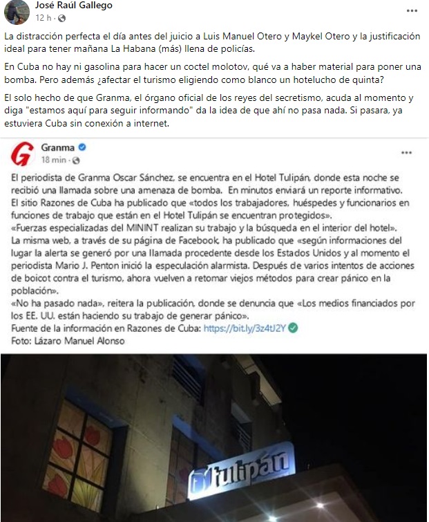 “He recibido varios reportes de una evacuación urgente del Hotel Tulipán en La Habana tras una amenaza de bomba. Los trabajadores y clientes están fuera del local ahora mismo, según me cuentan”, redactó el reportero en una publicación hecha en redes sociales.