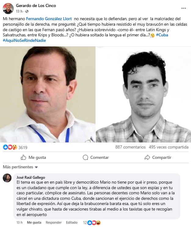 “Mi hermano Fernando González Llort no necesita que lo defiendan, pero al ver la malcriadez del personajillo de la derecha, me pregunté: ‘¿Qué tiempo hubiera resistido el muy bravucón en las celdas de castigo en las que Fernan pasó años?’. ¿Hubiera sobrevivido -como él- entre Latin Kings y Salvatruchas, entre Krips y Bloods? ¿O hubiera soltado la lengua el primer día?”, declaró.
