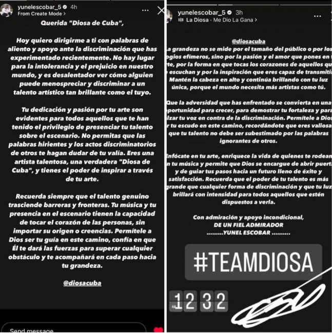 En sus historias de Instagram, el cubano se dirigió a La Diosa, exaltando su talento y su carácter, y aconsejándole no escuchar las palabras negativas, pues siempre habrá personas que quieran apagar un brillo como el suyo.