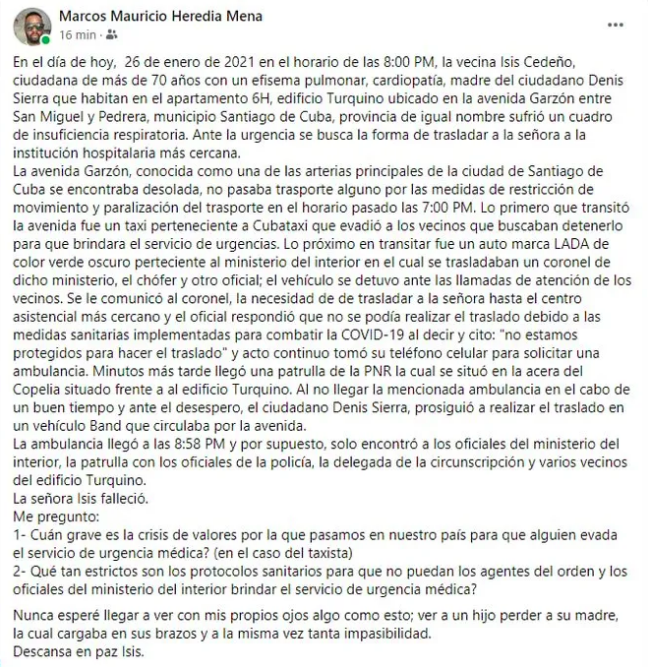 A través de las redes sociales llega la denuncia del internauta Marcos Mauricio Heredia Mena que expone el caso de una cubana en Santiago de Cuba que falleció en la espera de una ambulancia que la trasladara al hospital