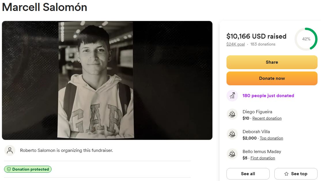 Actualmente, Roberto Salomón encabeza una campaña en GoFundMe que ha logrado reunir más de 3.100 dólares de una meta de 4.500, gracias al apoyo de 62 donantes.