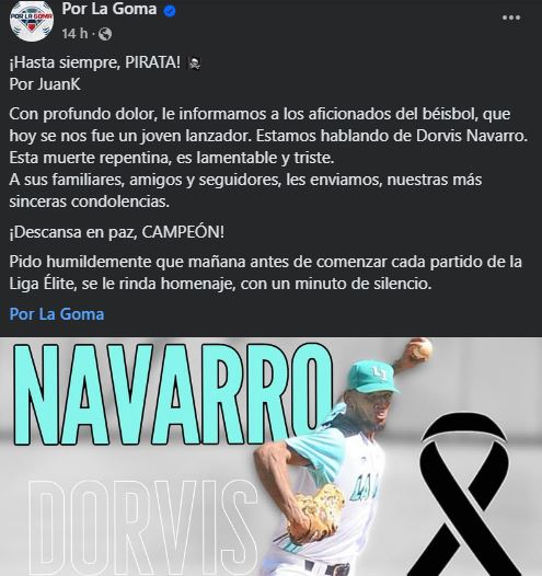 “Hasta siempre, PIRATA. Con profundo dolor, le informamos a los aficionados del béisbol que hoy se nos fue un joven lanzador. Estamos hablando de Dorvis Navarro. Esta muerte repentina es lamentable y triste. A sus familiares, amigos y seguidores les enviamos nuestras más sinceras condolencias. Descansa en paz, CAMPEÓN”, escribió por su parte JuanK, del portal deportivo Por la Goma.