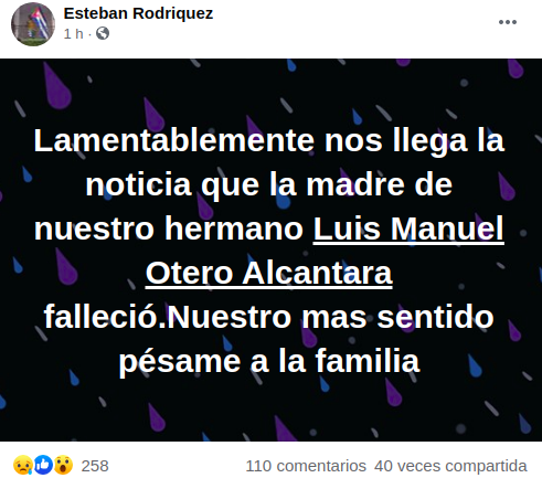 “Lamentablemente nos llega la noticia que la madre de nuestro hermano Luis Manuel Otero Alcantara falleció. Nuestro mas sentido pésame a la familia”, escribió Rodríguez en el post.