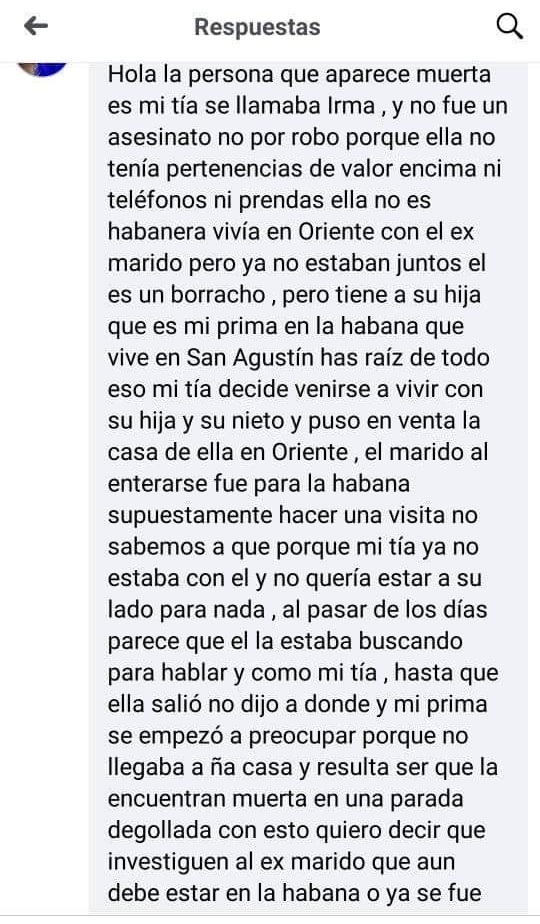 “Mi prima se empezó a preocupar porque no llegaba a la casa y resulta ser que la encuentran muerta en una parada degollada, con esto quiero decir que investiguen al exmarido que aún debe estar en La Habana o ya se fue”.
