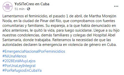 “Lamentamos el feminicidio, el pasado 1 de abril, de Martha Morejón Noda, en la ciudad de Pinar del Río, que comprobamos con fuentes comunitarias y familiares. Su expareja, a la que había denunciado en años anteriores, le quitó la vida, para luego suicidarse”.
