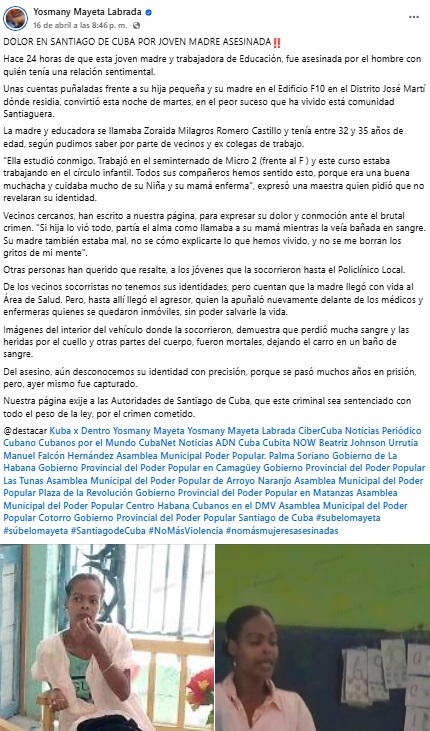 Cubanos acudieron a redes sociales para denunciar el asesinato de Zoraida Milagros Romero Castillo, una madre dedicada de entre 32 y 35 años, que fue ultimada el pasado martes en su hogar en la ciudad de Santiago de Cuba.