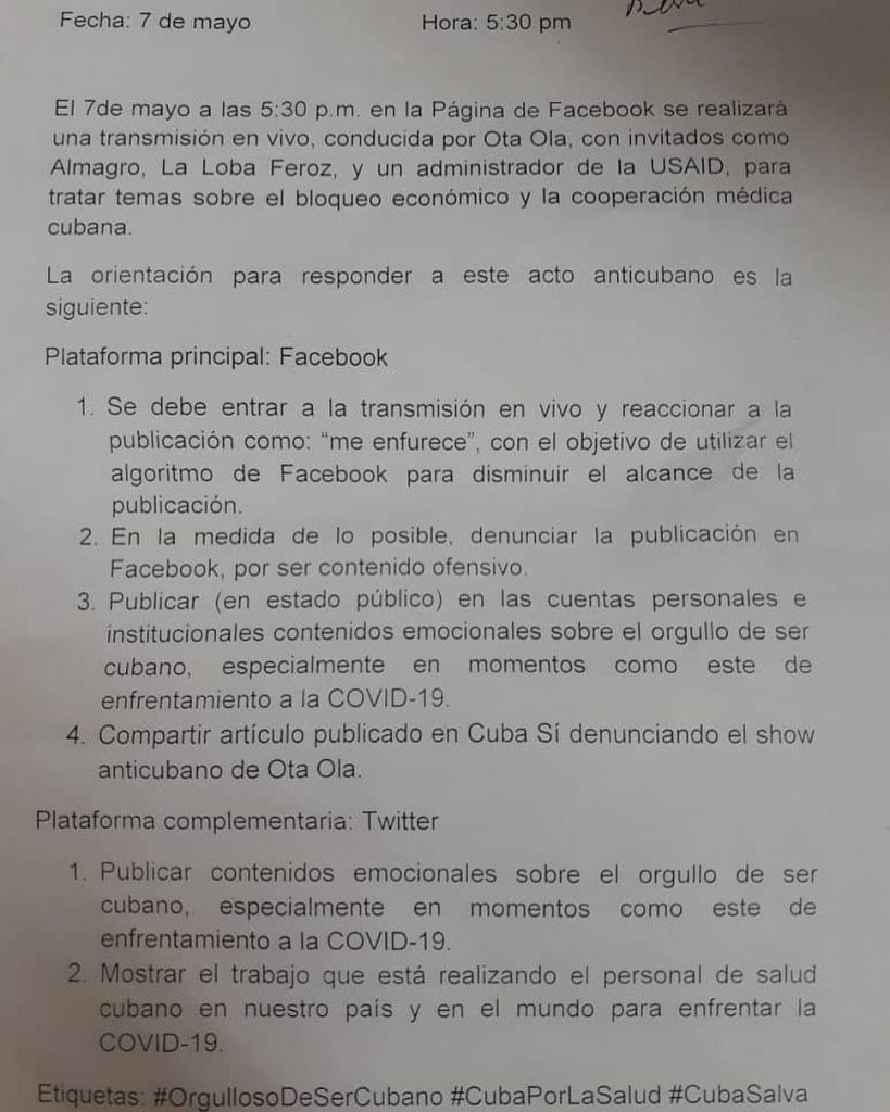 “El 7 de mayo a las 5.30 p.m. en la página de Facebook se realizará una transmisión en vivo, conducida por Ota Ola, con invitados como Almagro, La Loba Feroz, y un administrador de la USAID, para tratar temas sobre el bloqueo económico, y la cooperación médica cubana”, encabezaba el documento emitido por autoridades cubanas con orientaciones específicas a diplomáticos y cubanos que se encuentran de misión en el exterior para que ejecuten las siguientes acciones: