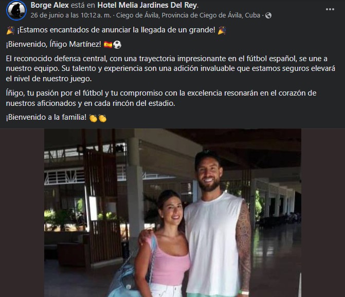 “¡Estamos encantados de anunciar la llegada de un grande! ¡Bienvenido, Íñigo Martínez! (…) jugador con una trayectoria impresionante en el fútbol español”, escribió en un confuso post de Facebook.
