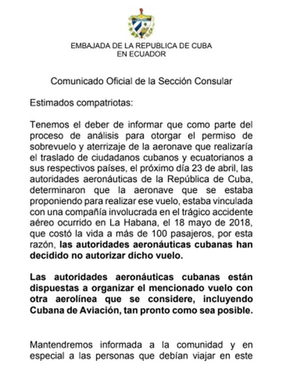 “Las autoridades aeronáuticas cubanas están dispuestas a organizar el mencionado vuelo con otra aerolínea que se considere, incluyendo Cubana de Aviación, tan pronto como sea posible”, aseguraron en la nota del Consulado cubano en Ecuador.