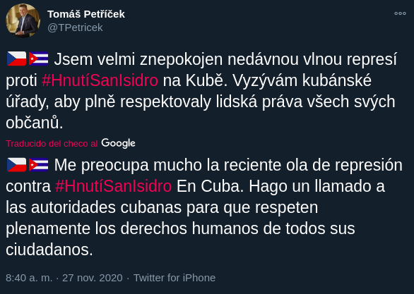 Otro gobierno que manifestó su apoyo fue el de República Checa, cuyo Ministro de Relaciones Exteriores, Tomáš Petříček, condenó la represión comunista y manifestó su preocupación por los huelguistas del Movimiento San Isidro.
