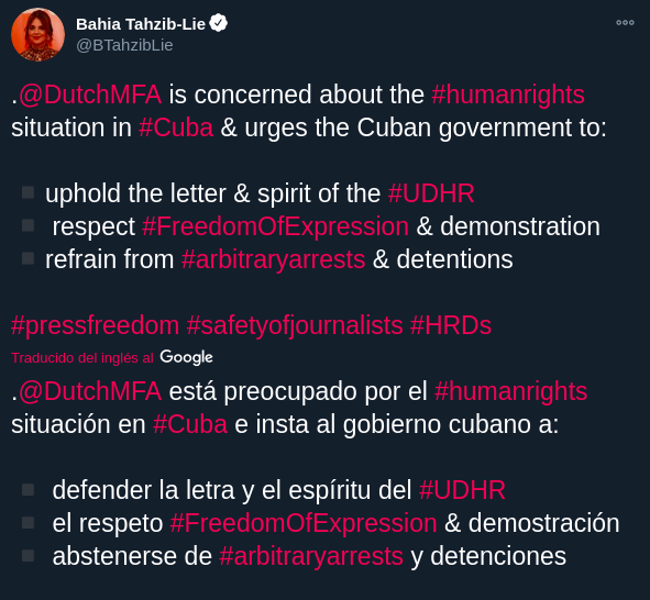 Tal es el caso de Bahia Tahzib-Lie, embajadora de Derechos Humanos del Ministerio de Relaciones Exteriores del Reino de los Países Bajos (Holanda), quien a través de sus redes sociales mostró su preocupación a las violaciones de derechos humanos que está llevando a cabo el régimen de Cuba contra los disidentes dentro de la Isla.