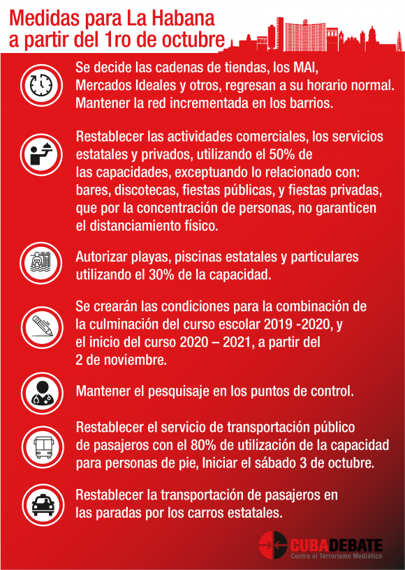 Luego de un mes de medidas restrictivas, autoridades de la provincia de La Habana anunciaron en la tarde de este miércoles las nuevas acciones de enfrentamiento a la Covid-19, en vigor a partir de este 1ro de octubre.