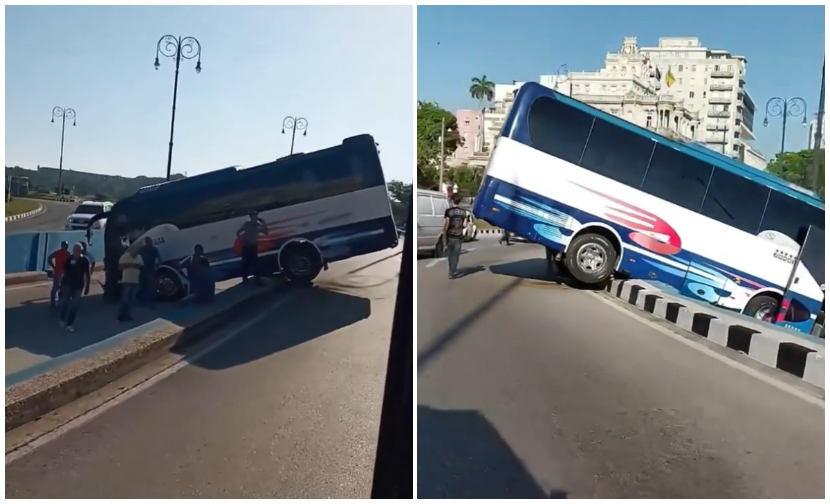 La guagua parece pertenecer a la empresa estatal Transtur, del Ministerio de Turismo (Mintur), y esta terminó atascada luego de que la sección delantera del vehículo cayera de una parte elevada de la carretera.