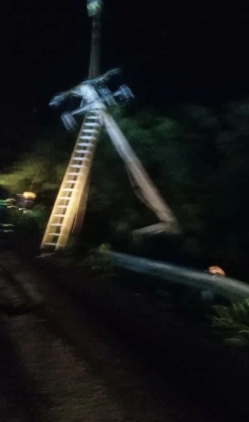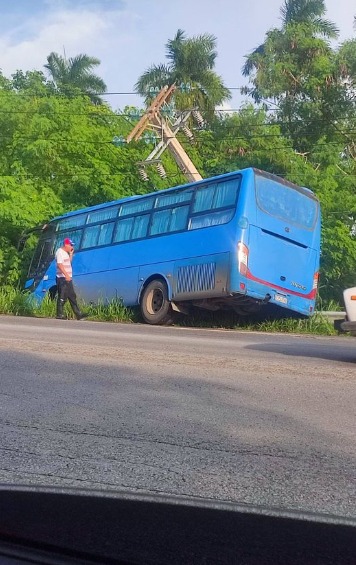 Reportes en el grupo de Facebook “Accidentes de Buses & Camiones” mostraron imágenes del autobús chino, que quedó incrustado en el poste de cemento, derribando los cables de alta tensión.