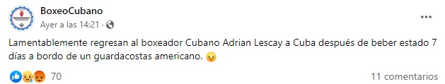 “Lamentablemente, regresan al boxeador cubano Adrian Lescay a Cuba después de haber estado 7 días a bordo de un guardacostas americano”, se lee en la publicación.