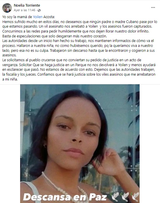 “Le solicitamos al pueblo que no conviertan su pedido de justicia en un acto de venganza. Solicitar que se haga justicia en un parque no nos devolverá a Yoilén y menos ayudará en esclarecer lo que pasó. No estamos de acuerdo con esto. Dejemos que las autoridades trabajen, la fiscalía y los jueces. Confiamos que se hará justicia sobre los viles asesinos que me arrebataron a mi niña”, redactó la mujer en Facebook.