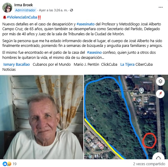 El cuerpo de José Alberto Campo Cruz, el cubano de 65 años reportado como desaparecido desde el 3 de enero en Morón, Ciego de Ávila, fue encontrado en el patio de una vivienda, según informó en redes sociales la activista Irma Broek.