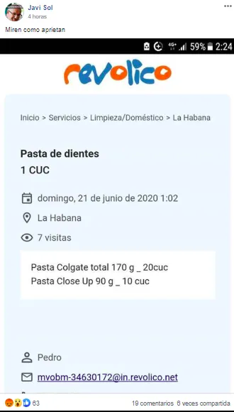Y es que en el portal de compra-venta Revolico, donde la mayoría de los cubanos comercializan artículos online, un tubo de pasta de dientes Colgate alcanza valores de hasta 20 CUC o 500 CUP.