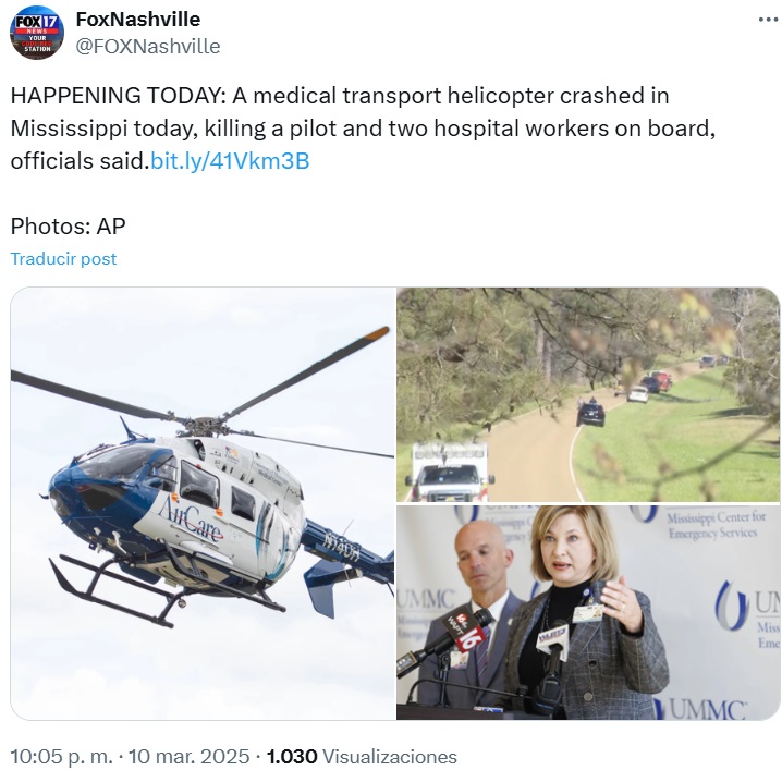 La universidad destacó que este fue el primer accidente en los 29 años de historia del servicio AirCare, un sistema de transporte aéreo médico de emergencia que opera en todo Mississippi. De momento, las autoridades continúan evaluando las causas de este y otros incidentes similares que han estado ocurriendo en los últimos meses.