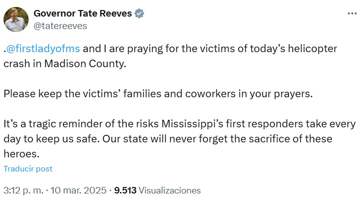 “La primera dama de Mississippi, Elee Reeves, y yo estamos rezando por las víctimas del accidente de helicóptero ocurrido hoy en el condado de Madison. Por favor, tengan presentes en sus oraciones a las familias y compañeros de trabajo de las víctimas”, escribió.