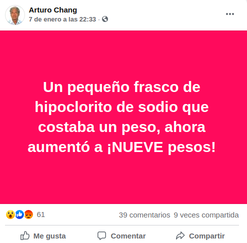 “Un pequeño frasco de hipoclorito de sodio que costaba un peso, ahora aumentó a ¡NUEVE pesos!”, indicó en una publicación de Facebook.