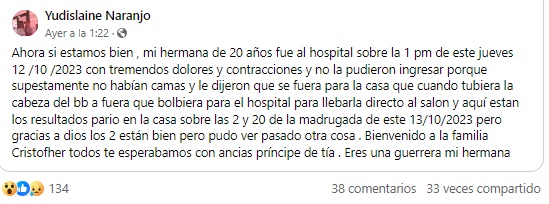 “Fue al hospital sobre la 1:00 p.m. de este jueves 12 de octubre de 2023 con tremendos dolores y contracciones, y no la pudieron ingresar porque, supuestamente, no había camas. Le dijeron que se fuera para la casa, que cuando tuviera la cabeza del bebé afuera volviera al hospital para llevarla directo al salón”, inicia la denuncia.