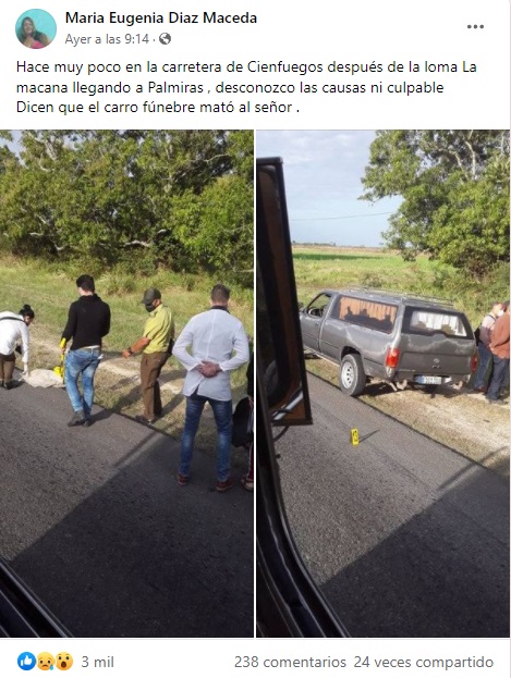 “En la carretera de Cienfuegos, después de la loma La Macana, llegando a Palmira. Desconozco las causas, ni culpable. Dicen que el carro fúnebre mató a un señor”, se lee en la breve publicación de la mujer, quien compartió fotografías de los policías reuniendo evidencia.