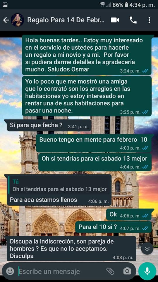 Según el reportaje del mismo medio, una pareja de lesbianas recibió otro “portazo en la cara” al reservar en ese alojamiento. “Incluso ya habían pagado por adelantado la mitad del servicio”, contó Ávila Valdeón, quien no dudó en comunicarse con otros afectados de esta promoción cero inclusiva.