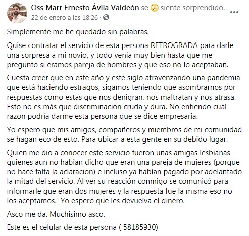 “Alguien hizo nuestra misma publicación o contactaron a una persona que tiene que ver con las decoraciones. Ella hace su servicio independiente, nada que ver con el de nosotros. Hasta hoy supe que, por problemas religiosos, ellos no hacían este tipo de servicio”, continuó la mujer, quien no ofreció los datos de contacto de la presunta decoradora, pese a la solicitud del colectivo LGBTI+ Plataforma 11M