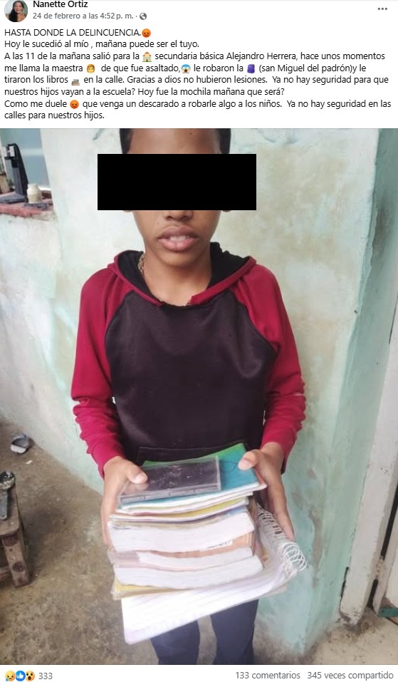 “¡Hasta dónde la delincuencia! Hoy le sucedió al mío, mañana puede ser el tuyo”. También cuestionó la falta de seguridad para los menores en la Isla: “¿Ya no hay seguridad para que nuestros hijos vayan a la escuela? ¿Hoy fue la mochila, mañana qué será?”, agrego.
