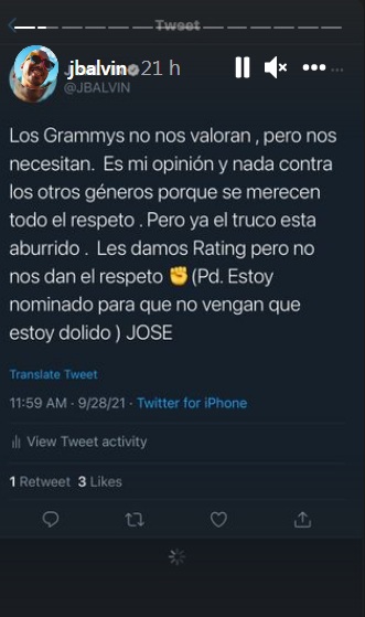 “Los Grammys no nos valoran, pero nos necesitan. Es mi opinión y nada contra los otros géneros porque se merecen todo el respeto. Pero ya el truco está aburrido. Les damos Rating, pero no nos dan el respeto (Pd. Estoy nominado para que no vengan que estoy dolido)”, escribió el cantante en su red social.