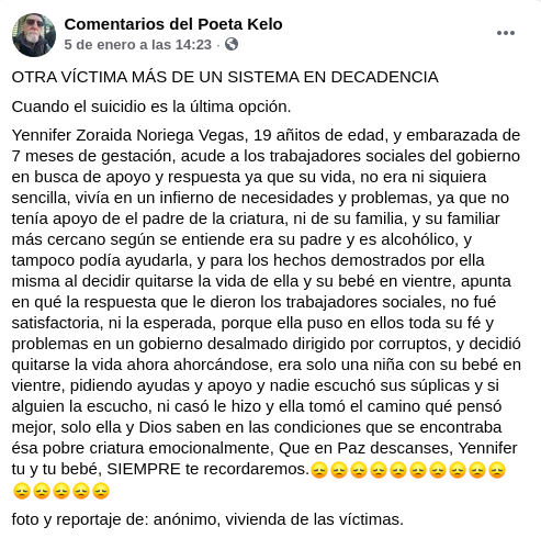 Así lo dio a conocer a través de una publicación de Facebook, el bloguero que se identifica como Comentarios del Poeta Kelo, donde asegura que la joven 19 años de edad, Yennifer Zoraida Noriega Vegas, se quitó la vida tras entrar en desesperación por su crítica situación económica.