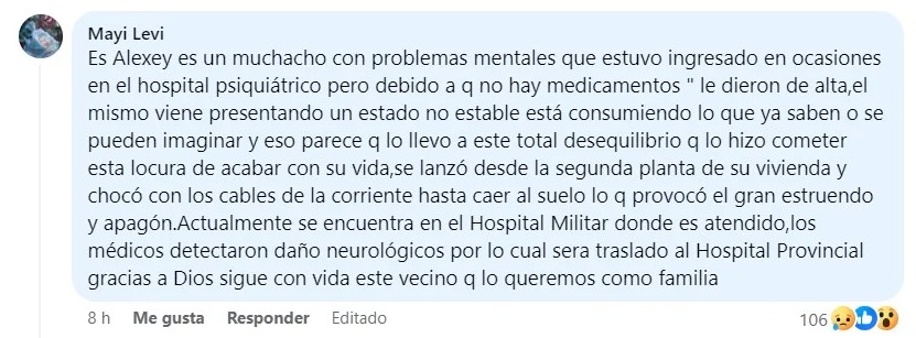 “Se lanzó desde la segunda planta de su vivienda y chocó con los cables de la corriente hasta caer al suelo lo que provocó el gran estruendo y apagón. Actualmente se encuentra en el Hospital Militar donde es atendido. Los médicos detectaron daños neurológicos por lo cual será traslado al Hospital Provincial”, concluyó la fuente.