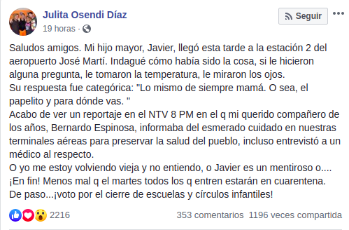 “Acabo de ver un reportaje en el NTV (Noticiero de la Televisión Cubana) 8 PM en el que mi querido compañero de los años, Bernardo Espinosa, informaba del esmerado cuidado en nuestras terminales aéreas para preservar la salud del pueblo, incluso entrevistó a un médico al respecto. O yo me estoy volviendo vieja y no entiendo, o Javier es un mentiroso”, explicó en el post.