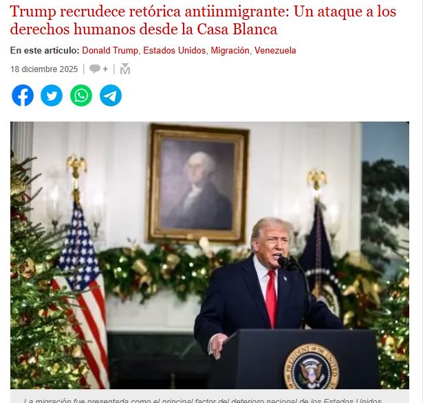 El texto oficialista se centra en un mensaje televisado de Trump desde la Casa Blanca, en el que el mandatario estadounidense volvió a colocar la migración como eje de su narrativa política, vinculando a los inmigrantes indocumentados con criminalidad y deterioro social.