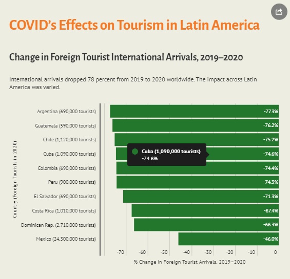 Uno de los ejemplos ilustrativos es el caso de Cuba, país cuya industria turística se vio prácticamente colapsada. Un informe conjunto de la Sociedad de las Américas y del Consejo de las Américas señala que la Isla apenas recibió 1.090.000 turistas en 2020, un decrecimiento del 74,6% con respecto al año anterior.