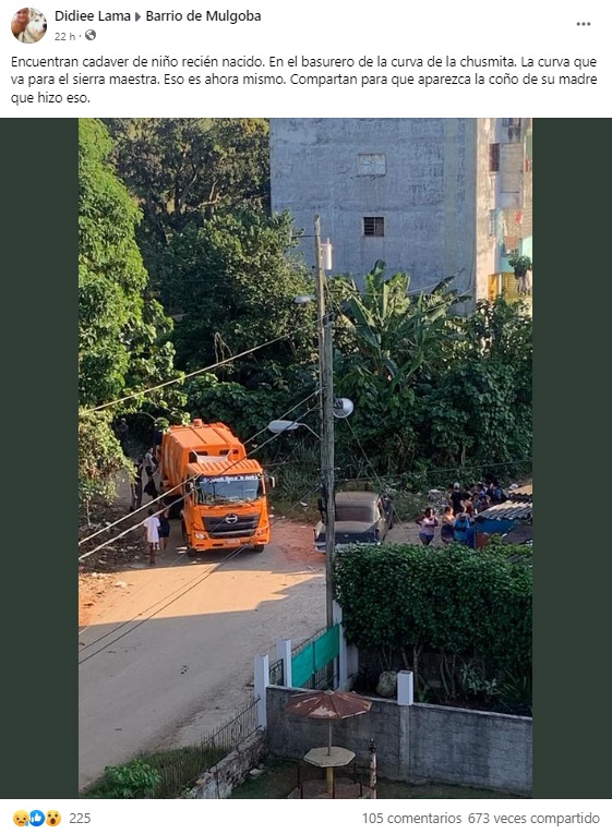 “Encuentran cadáver de niño recién nacido. En el basurero de la curva de La Chusmita, la curva que va para el Sierra Maestra. Eso es ahora mismo. Compartan para que aparezca la coño de su madre que hizo eso”, se lee en la publicación hecha por la usuaria de Facebook, Didiee Lama.