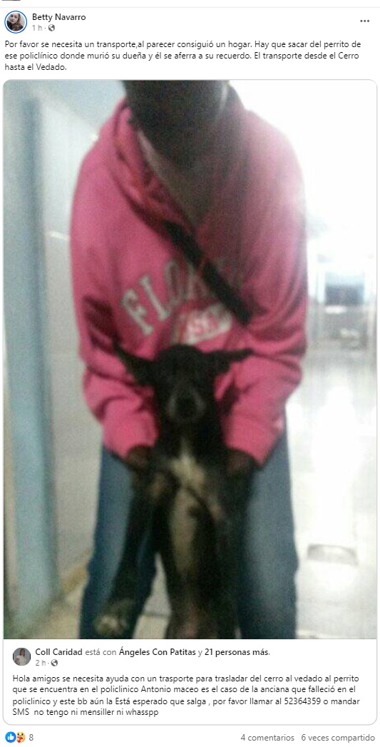 “Por favor, se necesita un transporte, al parecer consiguió un hogar. Hay que sacar al perrito de ese policlínico donde murió su dueña. El transporte desde el Cerro hasta el Vedado”, recalcó, mientras compartía otra publicación que dejaba el 52364359 como número de contacto.