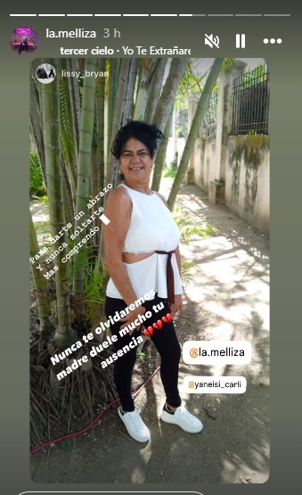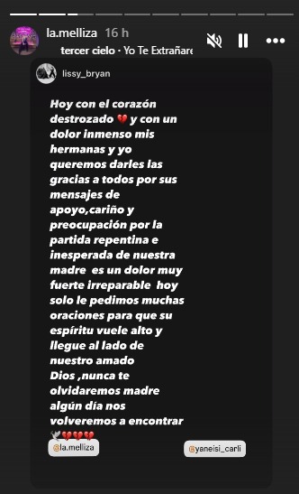 “Nuevamente quiero darle las gracias a todos mis seguidores, han sido miles (…) les doy la gracias por tomarse un minuto de su tiempo para darme el pésame, a mí y a mí familia (…) Escogí las mejores personas para trabajar, al momento todo mundo me escribió y me dijo, ‘Melliza no hay problema, tómate tu tiempo’ (…) yo me siento lista y preparada ya para empezar en mi trabajo, sé que mi madre va a descansar en paz en el cielo. Me duele profundamente el corazón, porque es mi madre que yo amaba con la vida (…) ella era una excelente madre, la mejor madre (…) pero vamos a continuar con la vida, tenemos hijos y tenemos que seguir adelante”, señaló.