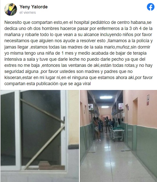 Así lo demuestran las denuncias contra el Hospital Pediátrico de Centro Habana, donde dos hombres se habrían hecho pasar por enfermeros para robar las pertenencias de los familiares en las salas durante la madrugada.