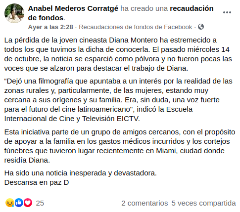 “El propósito es apoyar a la familia en los gastos médicos incurridos y los cortejos fúnebres que tuvieron lugar recientemente en Miami, ciudad donde residía Diana. Ha sido una noticia inesperada y devastadora. Descansa en paz D”.