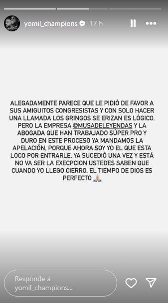 “Alegadamente, parece que le pidió de favor a sus amiguitos congresistas y con solo hacer una llamada los gringos se erizan”, expresó Yomil además en el texto en sus stories.