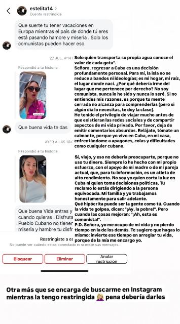 A través de Instagram, la viuda de Daniel Muñoz ‘El Dany mostró en sus historias cómo una usuaria cuestionaba que ella viaje mientras “el país de donde tú eres está pasando hambre y miseria”, sugiriendo además que “solo los comunistas pueden hacer eso”.