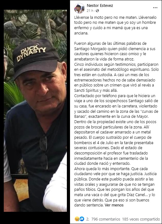 “‘Llévense la moto, pero no me maten, llévenselo todo, pero no me maten, que yo soy un hombre enfermo y cuido a mi mamá, que ya es una anciana’, fueron algunas de las últimas palabras de Santiago Morgado, quien pidió clemencia a sus captores”, se lee en una publicación compartida por Estévez.