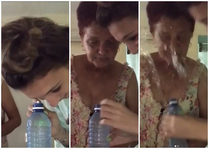 En el video se puede ver a la joven haciéndole creer a su abuela que había visto una larva en su botella de agua; cuando la anciana se acerca hasta el recipiente para ver de qué hablaba su nieta ésta presiona la botella haciendo salir el agua que le cayó en todo el rostro a la señora.