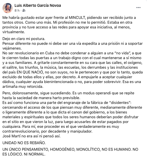 Luis Alberto García: No ser revolucionario en Cuba no debe condenar a alguien