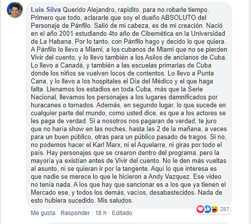 El post texto acumuló cientos de comentarios, la mayoría críticos con sus palabras y de apoyo a los actores de Vivir del cuento. Silva explicó el origen de su personaje Pánfilo y le respondió que es el “dueño absoluto del personaje”.
