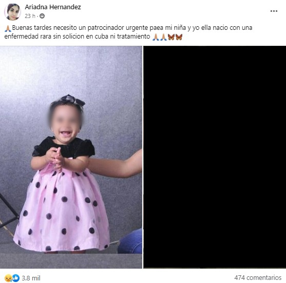 “Buenas tardes, necesito un patrocinador urgente para mí y mi niña. Ella nació con una enfermedad rara sin solución ni tratamiento en Cuba”, se lee en la publicación.