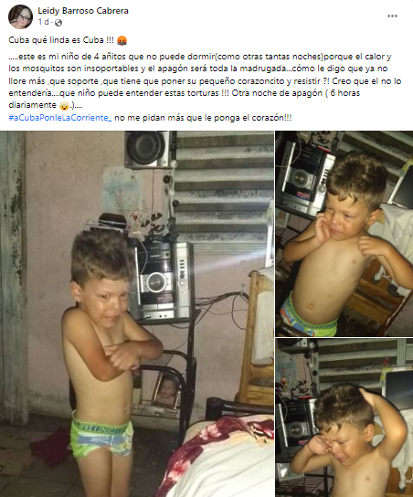 “Este es mi niño de cuatro añitos que no puede dormir (como otras tantas noches) porque el calor y los mosquitos son insoportables y el apagón será toda la madrugada. Cómo le digo que ya no llore más, que soporte, que tiene que poner su pequeño corazoncito y resistir. Creo que él no lo entendería. ¡Qué niño puede entender estas torturas!”, escribió en un breve mensaje en su muro de Facebook.